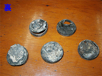 | 下の写真が外したプラグです。 破けているのは、外す時に壊して抜く為。 左は表(エンジンの外側)、右は裏(エンジンの内側)です。 表側は、それほど痛んでいません。 しかし、裏側はクーラントに浸かっており、錆びと腐食が発生しています。 錆びによって隙間が出来、そこから漏っていたのでしょう。 |