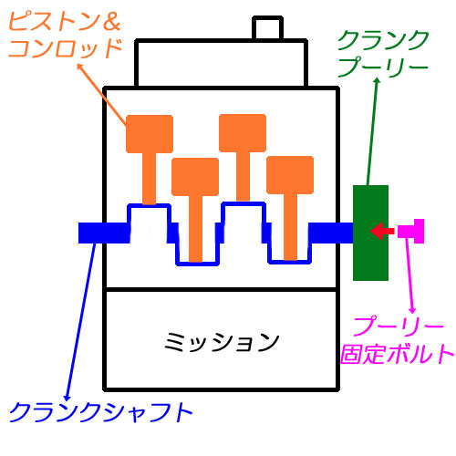 このボルト(上図、ピンクの部分)はそのプーリーをクランクに固定する為のもの。