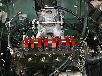 | 赤いロッカーアームが目立つTITAN社ローラーロッカー。 ローラーロッカーとは、バルブを押すロッカーアームの先端部分がローラーになっており、フリクションを減らし磨耗も防止するという役目を持っている物。 実際ローラーロッカーを付けたからといって、ピークパワーが大きく変るわけでない。 しかし、バルブをローラーで押すので、ノーマルのロッカーアームで押す場合と違いスムーズに押し下げる事が出来る。 ノーマルは鉄の塊でバルブを押しているので、押し下げる場合も後ろ方向に引きずりながら下げていくイメージになる。 当然、こすれた部分は磨耗し、また、後ろ方向へ引いている訳だからバルブガイドの偏磨耗につながる場合もある。 長い目で見れば、磨耗防止という観点で見ると効果は大きい。 また、ローラーロッカーの中にはバルブのリフト量(バルブが押し下げられ開いている時間)を変えるタイプの物がある。 これはハイリフト・ロッカーと呼ばれる物で、ローラーロッカータイプの物と、ノーマルと同じタイプの物とがある。 ハイリフト・ロッカーについては別項目で紹介します。 パワーアップと言う点では、大きくは望めませんがエンジン保護と言う点ではお勧めしたいパーツです。 |