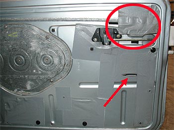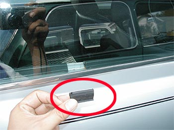 下の写真の赤丸が、切り取ったウェザーストリップです。