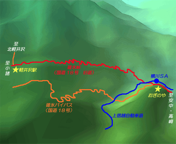 | まず国道18号で松井田から軽井沢方面に向かいます。 上信越自動車道をくぐり、右手に横川駅(信越本線)があります。 その正面に「おぎのや」というドライブインがあります。釜飯の大きな看板があるドライブインです。 ひとまずここで一息入れましょう。 「おぎのや」で休憩したら、いよいよ旧道に向かいます。 国道18号を500mくらい進むと緩い右カーブになるのですが、曲がりきるあたりで左斜めに入る道があります。 これが旧道の入り口です。 旧道という看板が出てるので、すぐに解ると思います。 旧道側に入ると18号の上を通り、しばらく直線が続きます。 直線が終わるとお待ちかねの峠道。 峠道が始まったら2速メインで5000rpmくらいまで回してあげて下さい。 2速、3速は使いますが、4速は使いません。 あまり早くシフトアップしてしまうと失速して登らなくなってしまいます。 小さいコーナーが多いですから、コーナーでは2速、コーナーを抜けてストレートで3速という感じです。 小さいコーナーが連なっている所では、2速キープで登って行きます。 コーナーにはそれぞれ番号が付いていて1番コーナーから184番コーナーまで。 1番から始まり、軽井沢側の最終が184番。 これでもかっ!というくらいコーナーが続きます。 コーナーはブラインドもあり、対向車に注意して走りましょう。 また、一般車輌で遅い車もいます。 無理をせず、いつでも余裕のある走りを心がけて下さい。 ゴールは軽井沢の駅前。 そのまま軽井沢から北軽井沢方面へ抜ければ違う峠も楽しめます。 軽井沢でゆっくりしていくのも良いですね。 途中、ガードレールの上にサルがいたり、紅葉シーズンなどは、キレイな紅葉を見ながら走る事が出来ます。 飛ばすだけでなく、ゆっくりと景色を見ながら走るにも最適。 県内はもとより近県の方は是非走って見ましょう。 |