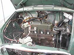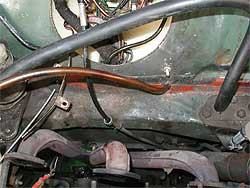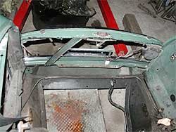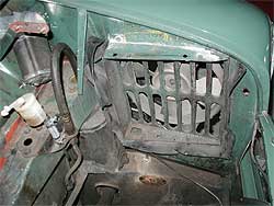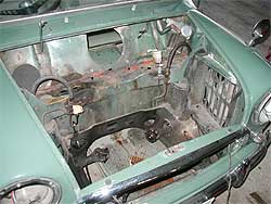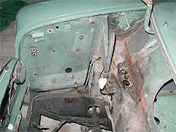 | エンジンを降ろした後のエンジンルームを見てみましょう。 マスターシリンダーの下は、フルードで塗装がやられています。 しかし、全体的に大きな錆びや腐りはありません。 過去に一度レストアを行っているので、この状態で済んでいると行ってもいいでしょう。 |