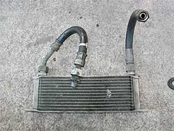 | エンジン本体のオイル漏れは、サイドカバーとクラッチ側ラージシールから。 クラッチ側はディスクにもオイルが回ってしまい、ディスクも交換します。 また水回りでは、ホース内にかなり汚れが溜まっており、ウォータージャケット清掃、そしてラジエターはオリジナルの物をオーバーホールします。 |