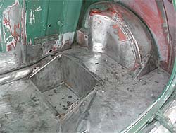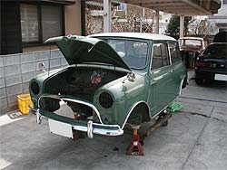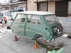 | 足回りやフレーム等の降ろされたボディです。 まだ、バンパーやグリルサンズ等は残されていますが、ほぼ裸にされている状態です。 |