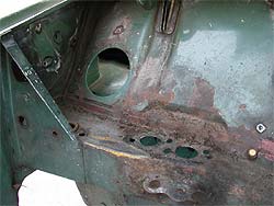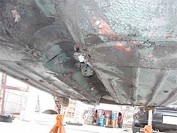 | 次はフロアです。 フロア下を見てみると大きなへこみや歪みもなく、塗装の状態を除けば良いですね。 塗装は、アンダーコートの吹き方が悪いですが、やり直すのでOK。 また、フレームの取り付け部にも大きな錆び等もなく、歪みがなかったので安心しました。 |