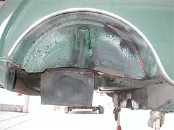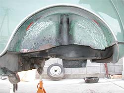 | 最後に各フェンダーの内側を見てみましょう。 ここも、アンダーコートを吹かれ処理されているのですが、アンダーコートがひび割れ剥がれてしまっています。 ただ、錆びはそれ程無く、状態としては良いですね。 アンダーコートは全て剥離してしまいます。 |