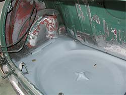 | まずは、前回錆びによって穴が開いていたトランクから。 トランクは別な車輌から移植を行い板金にて仕上げていきます。 グレーに見える部分はサフェーサー(下地剤)です。 |