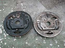 | ディスクブレーキのバックプレート 左は処置前、右は錆び落とし済み | ドラムバックプレート 左が処置前、右が処置済み | |