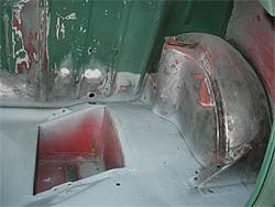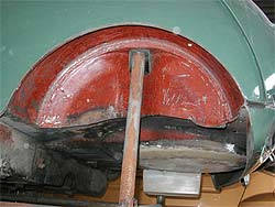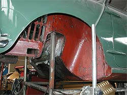 | 次に、フェンダーの内部を見て見ましょう。 前回、アンダーコートに覆われていたのを紹介しましたが、アンダーコートは全て取り除かれ、下地の塗装が出ています。 アンダーコートを剥がしてみて、鉄板自体はそれ程腐食していない事が判明。 この後は、更に塗装を落とし、鉄板を剥き出しにしていきます。 |