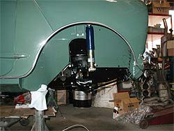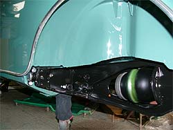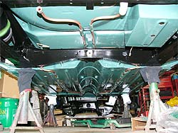 | ボディ下部から見た図。 中央に見える配管はハイドロ用のもの。 | サブフレームの搭載が完了。 |