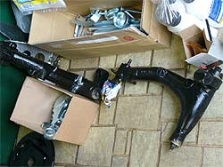 | フロントのサブフレームが搭載出来た時点で、再度リア側の作業に戻ります。 ラジアスアームやワイヤーなど、細かいパーツを組み付けていきます。 |