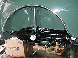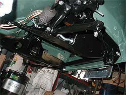 | 下から見ると、足回りのアーム類がキレイに塗装され、再メッキしたパーツが光っているのが良く解ります。 | フレームを正面下から。 テンションロッドのワッシャー等も再メッキかけています。 |