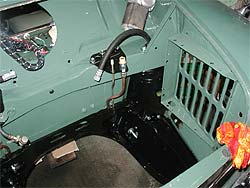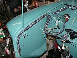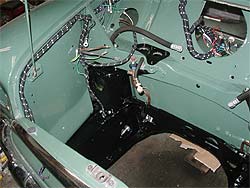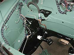 | ワイヤーハーネスの取り回しにも注意を払います。 今では新品ハーネスは貴重な部品。 | ワイパーモーターも取り付け完了。 エンジンルーム下ではステアリングラックも取り付け済み。 | |