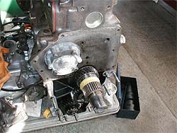 | まず、オイルポンプを組み付けます。 この時に、新品のオイルポンプは良く摺り合わせを行い、スムーズに動くのを確認してから組み付けています。 また、下の写真でコアプラグが新しくなっているのが解るでしょうか? |