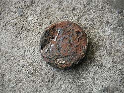 | 赤丸の中が、穴が開いてしまった部分です。 | 外したコアプラグの裏側を見ると、びっしりと錆が広がっています。 |