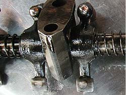 | 続いて下の写真はロッカーアーム。 クーパーSは、写真のように鍛造の物が使用されています。 バルブに当たる面が多少削れてはいますが再使用可能な程度。 一度キレイに面出しを行い、再取り付けします。 また、ロッカーアームはOKでしたが、シャフト及びポストは磨耗が激しい為に交換します。 |