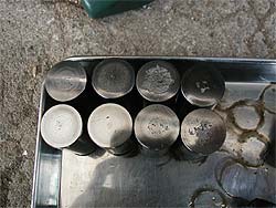 | ブロックを磨いていると、ちょっとした事件?発生です。 コアプラグ(ブロック内で水が凍ってしまった場合などに抜けて圧力を逃がす為のもの)に穴が開いてしまいました。 長い年月使用され、かなり錆が侵食していたようです。 コアプラグを全て抜き取り、新しく入れ替える事となりました。 |