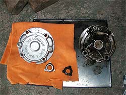 | 全体に細かい擦り傷が入っています。 | 上の写真の左側が交換する新しいポンプ。 ポンプと同時にドライビング・フランジも交換。 |