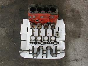 | まずは、前回バラしたエンジンの心臓部、シリンダーから。 写真は、バラした状態のシリンダー、ピストン&コンロッド、カム、そしてクランクです。 |