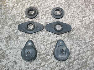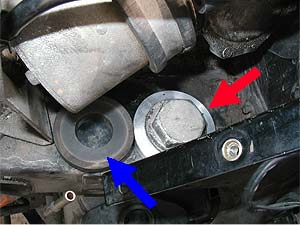 | ボディ側では追加の作業を行います。 今回エンジンを降ろすにあたり、痛んだサブフレーム・マウントは交換するのですが、サーキット走行等を考えマウント類をリジット化します。 これにより、高速コーナーやブレーキング時のヨレが無くなり安定した走行が可能となるのです。 ゴム製の物が外したノーマルのマウントです。 下の写真の赤い矢印の先がリジット・マウント、隣に置いてある青い矢印の先はノーマルです。 |