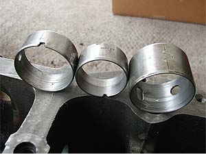 | ここで、内燃機屋さんへ出していたシリンダーの加工が終わり戻ってきました。 指定クリアランスでしっかりと加工されています。 また、一番下の写真は元々使用していたカムメタル。 良くみると虫食いや傷が入っています。 もちろんカムメタルは交換となります。 |