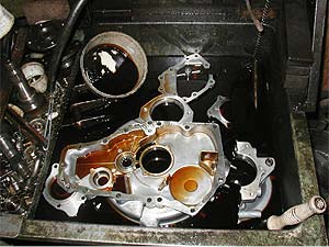 | シリンダーを加工に出し、その間に他のパーツを仕上げていきます。 ケース類は清掃し、タイミングチェーン・カバー等は錆を落とし再塗装の準備。 |