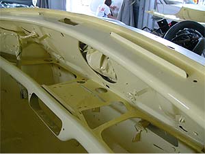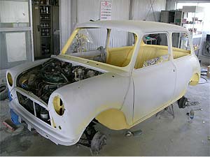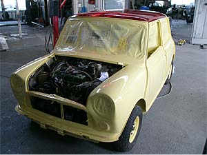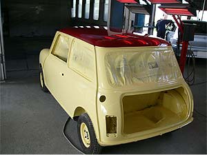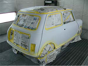 | マスキングも終了し、外側に色をいれる段階となりました。 ルーフまでマスキンングがしてあるのはツートン・カラーになる為。 どんな感じになるのでしょうか。 |