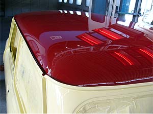 | 色が入れ終わり、乾燥&焼付け中です。 全体はクリーム、ルーフは茶色がかった赤。 室内で見る場合と、室外で見る場合で色合いは変ってきます。 まだメッキパーツが付いていないので雰囲気が出ていません。 焼付けが終了すれば磨きを入れ、メッキパーツ等を組みつけていきます。 |