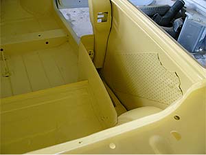 | まずは室内から色を入れていきます。 今回作成した色は、クリーム色っぽい黄色。 写真だと色が伝えづらいですが、中々カワイイ雰囲気の色です。 室内のフロアはモチロン、メーター回り、リアポケット内など、隅々の細かい所まで色を入れていきます。 |
