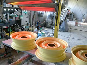 | 同時進行でホイール、トランクにも塗装を入れていきます。 今回、ホイールはボディ同色で。 赤く光って見えるのは、塗装を焼く為のランプの光です。 シッカリと焼きいれ、乾燥を行います。 |