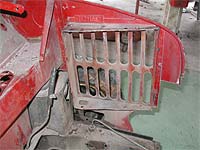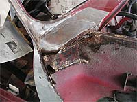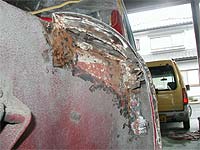 | 下の写真は、左右フェンダー後端の接合部、そして外したフロントパネルです。 見た目ほど錆は酷くありませんが、こだわって仕上げる為にここまで剥がしています。 また、フロントパネルも補修可能ですが、折角外したのですから新しい物と交換します。 |