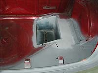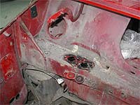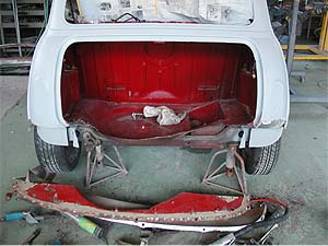 続いてリア。 リアではスカート部分、そしてスカートの合わせ目に錆があった為、スカートは交換する事にしました。 写真はスカート、トランクの後端部を切断した状態です。 もちろん、この後フレームも落として作業を行います。 |