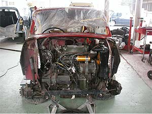続いてエンジンが降ろされました。 フレームとボディの位置関係がさらに良く解ると思います。 もちろん、最終的にフレームも落として仕上げる事となります。 |