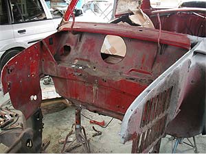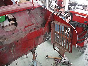 反対側、左のインナーパネル部分はそれ程錆が出ていませんでした。 こちらは錆取りを行い、必要な部分を新しいパネルに交換しています。 クローシングパネル(中央の黒いパネル)やスカットルパネル(ドアヒンジの付いているパネル)は交換済み。 まだ本固定ではなく仮止めの状態です。 |