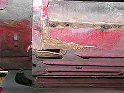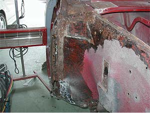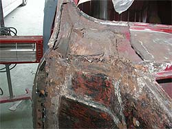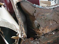 | 上の写真の部分をアップで見てみましょう。 ご覧のように錆が出てしまっています。 インナーパネルは交換してしまいますが、上の部分に関しては作成するような形となります。 また、今後の作業で紹介していきますが、シッカリと防錆剤を入れ水の浸入も防止し、錆を発生させにくくする事が重要となってきます。 |