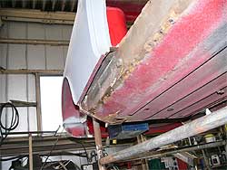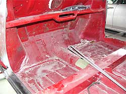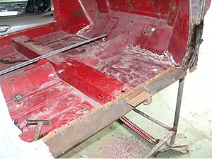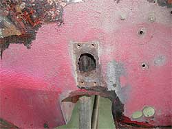 | フロア全体としては悪くは無いのですが、部分的に腐食はみられます。 まず、左下の写真、フロア後ろの部分に穴が開いてしまっています。 また、右下の写真はフロアの前側ですが、ここも塗装を剥離し状態を確認します。 その状態によっては、フロアの張替えという事も。 なにせ究極を目指していますから。 |
