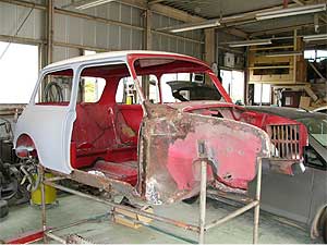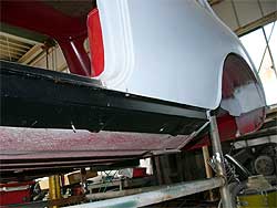 いよいよボディの下にヤグラを建てた状態となりました。 これで下回りの確認や、作業効率が上がる事となります。 ボディは一気にパネルを剥がしてしまうと歪んでしまい、形が崩れてしまいます。 下から順番に位置決めを行いながら作業を進めていきます。 |