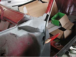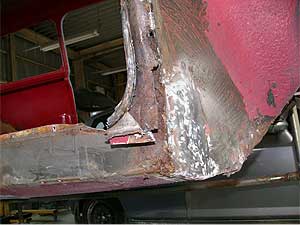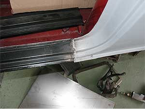 写真は同じく左側のドア下部分、ステップパネルです。 黒いパネルは新品なのですが、実際に取り付けるとミミの部分の寸法があいません。 他の部分のパネルにも言える事なのですが、意外と形が合わない事は多いのです。 「これは、作るしかないね」という事に。 |