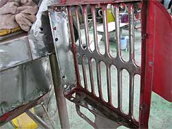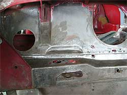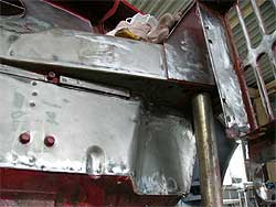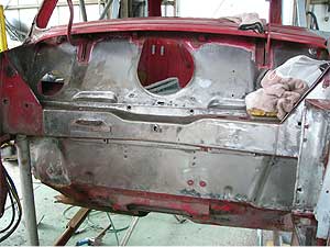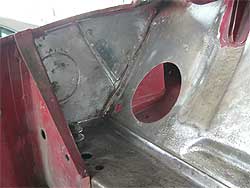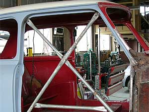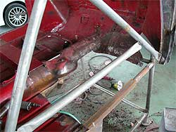 作業は進んでいくのですが、ここでボディに補強のパイプを溶接します。 車のボディはフロアを基準に形が決まっていますので、フロアに手を入れると形が崩れてしまうのです。 そこでクロスに補強を入れ、少しずつ手を加えていくのです。 つまり、ここに補強を入れるという事は、フロアに手を入れるという事です。 |