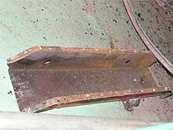 | 下の写真が手を入れ始めたフロア。 運転席のフロアが切り取られています。 フロアは前側の角に錆びが多く取り切らない為、新しく運転席側は張り替えます。 下の右の写真は、シートの下にあるメンバー。 フロアを切り取る際、こちらも切断し剥がしています。 助手席側にはメンバーが残っているのが解るでしょうか? メンバーは新しく交換するのですが、ボディの型崩れを防ぐ為に運転席側分を切り取っています。 メンバーの裏側はこれだけ錆びが発生していました。 当時の防錆があまり良くない証拠です。 |