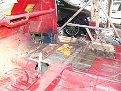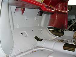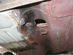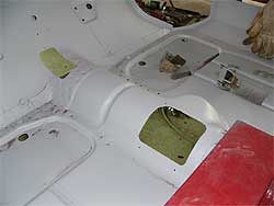 | フロア側は、錆びないよう直ぐにサフェーサーを入れます。 四角い穴の上側が使っていないダイレクト・ミッション用、手前がクーパーSに採用されているリモート・ミッション用です。 |