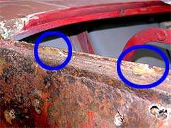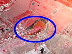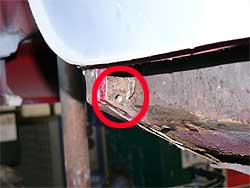 | ここで、ちょっと別な話しを。 張替えと同時に他の部分のチェック、そして、どの様に作業を進めるか検討していきます。 まず、運転席側のリア。 下の写真はリアのサブフレームが取り付けられる部分です。 赤丸の中はナットになっており、サブフレームを固定するボルトと接続されるのですが、この部分が思っているより状態が良くない。 今はサイドのパネルが剥がれているので直接作業ができますが、サイドパネルが付いてしまうと袋状になり、作業が出来なくなってしまいす。 また、袋状になるので湿気も溜まり易く、痛み易い場所でもあります。 そこで、今回、この部分は新しく造り直す事にしました。 |