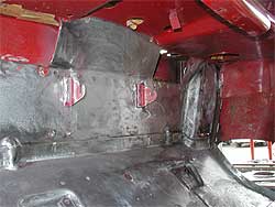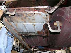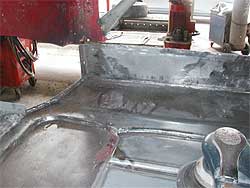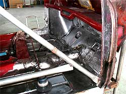 | さぁ、作業の方に戻りましょう。 成型したフロアに合わせ元のフロアを切り取り、その後キレイに溶接していきます。 熱による歪みや変形に気を使いながら作業します。 溶接後、すべての塗装を剥がし、下地を塗る準備。 銀色の部分が塗装を剥がし、生の鉄板となっている部分です。 運転席/助手席のフロア、そしてフロアの奥の部分まで剥がし終わっています。 右上の写真では、溶接跡を成型する前なので、ドコでつないだかが良く解ります。 |