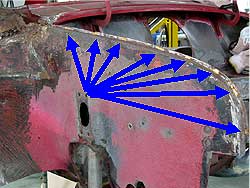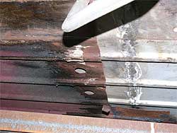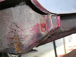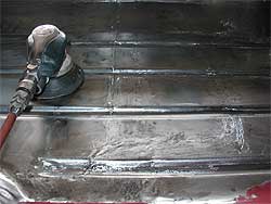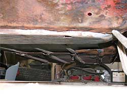 | ここで1つ問題が。 助手席側のフロアはどうするか検討中だったのですが、錆びがかなり深く研いで行くと穴が開いてしまいます。 錆びは残してしまうと広がってしまうので、徹底的に落とすのですが、穴が開いてしまっては仕方ありません。 写真の様なパネルの合わせ目がどうしても水分が溜まり易く、錆びの発生が多くなってしまう箇所。 結局、助手席側もフロアは張り替える事となりました。 しかし、一度に切ってしまうとボディの形が崩れてしまう為、運転席側の作業を全て終わらせ、それから助手席側に移ります。 |