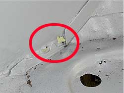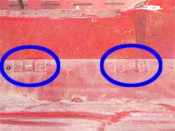 | こちらも過去のレストアを表す部分です。 左の青矢印の先に金色の部分があるのが見えるでしょうか? 右はその拡大写真です。 この金色の部分は、過去に溶接を行っている箇所です。 昔は、町工場にはスポット溶接機は無く、写真の様な金色の真鍮を使い溶接を行っていたそうです。 しかし、真鍮の溶接は強度的に弱く、永年使っているとクラックが入ってしまったりするのと、パネルの裏側に錆び止めの塗装をしても溶接の熱で焼けてしまい、そこから錆びるという事が多かったという事でした。 この車輌もフェンダーをレストアで交換していたのですが、やはり真鍮の部分が割れていたり、回りが錆びていたりしています。 今は錆び止め剤も良くなり、スポット溶接で必要な部分だけ融かせる為、強度、そして耐久性も格段に進歩しました。 |