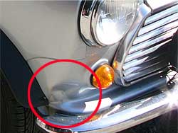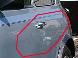 左の写真は作業前のもの。 赤線で囲んだ中がフェンダーの傷。 写真では解りにくいですが、傷自体の深さもあり、多少のヘコミもある状態。 |