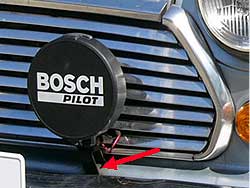 これが問題のフォグランプ。 赤矢印のステーを固定する為の穴が片側2箇所空けられている。 また、穴あけも位置が上手く決まらなかったらしく、何度か開け直している様子。 |