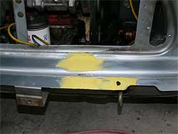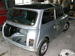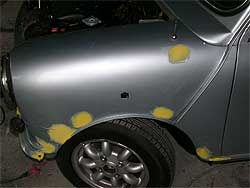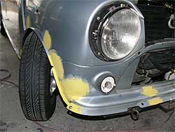 | 今回、外装はオリジナルと同色で仕上げます。 このキャブクーパーのカラーはクイック・シルバーと呼ばれるもので、キャブクーパーにしかなかった色になります。 また、クイック・シルバーはキャブクーパーの中でも販売台数が少なく、トータルで400台前後しかない希少色でもあるのです。 まずは全体を見回し傷のチェック。 そして外装関係のパーツを外していきます。 下左の写真は、左リアフェンダーですが、ここの傷が一番大きくありました。 傷を取る為に塗装を削り落としていきます。 銀色に削れている部分は、塗装が剥がされ下地の鉄板が出ている状態です。 下右の写真ではドアを中心に傷を拾い終わり、パテ(黄色い部分)が盛られた状態。 この後、極限までパテは削り、なるべくパテが無い状態にしていきます。 |