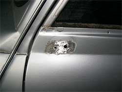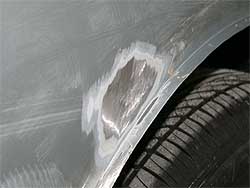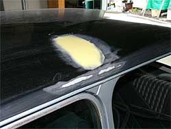 | おなじくフロント側、右フェンダーです。 ここはヘコミがあり、まず板金でキレイに修正。 同じくパテは最小限に。 また、ルーフにも軽いヘコミがあり、こちらもキレイに修正します。 |