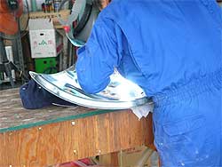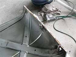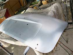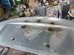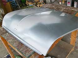 | MK−I仕様となると、ボンネットにも加工が必要となります。 先端のツバを切り落とし、錆びをキレイに研いで下地作りを行います。 エンブレムも変更になるので、エンブレムの穴も溶接で埋めていきます。 |
